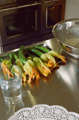 Stefanie was born and raised under the Mediterranean sun on a Greek island. From an early age she learned firsthand about Greek cuisine and when she moved to the Netherlands she took the proudly passed down family recipes with her. Jesse lived in Florence for some time, the place where Italian cuisine thrives and she herself became a connoisseur of the authentic taste of Italy. This came to fruition in the dinner they organized for Labro, which was heralded with a cool cynar spritz. Classic Tuscan fiori di zucca fritti and anchovy butter crostini, among others, were reserved as antipasti. The Italian spirit was continued with risotto al nero di seppia topped with bottarga and a splash of lemon as the main dish, and the evening was ended with homemade gelato.